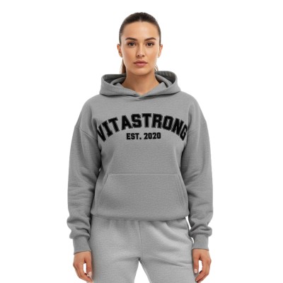 The College Hoodie Grey combines comfort, volume, and style. A unisex sweatshirt with an oversized fit , designed for those who live the Vitastrong spirit even outside the gym.