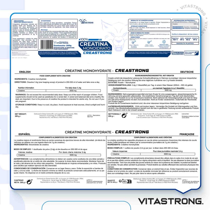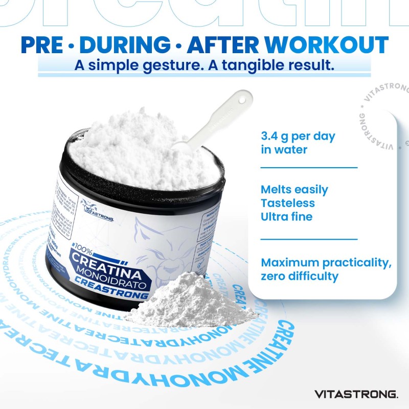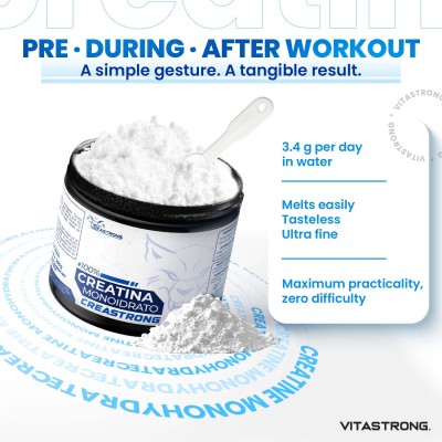 Creastrong® is an ultra-micronized creatine monohydrate (200 mesh), designed for athletes looking to maximize their performance. Thanks to its purity and advanced technology, this creatine dissolves easily in water, is rapidly absorbed by the body and enters the circulation in a short time, ensuring immediate support for intense workouts.