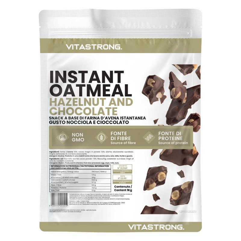 Vitastrong instant oatmeal, Hazelnut & Chocolate flavour: an embrace of authentic flavors and balanced nutrition. High fiber and protein content, with the pleasure of chocolate and the richness of hazelnut. Clean energy and pure taste!