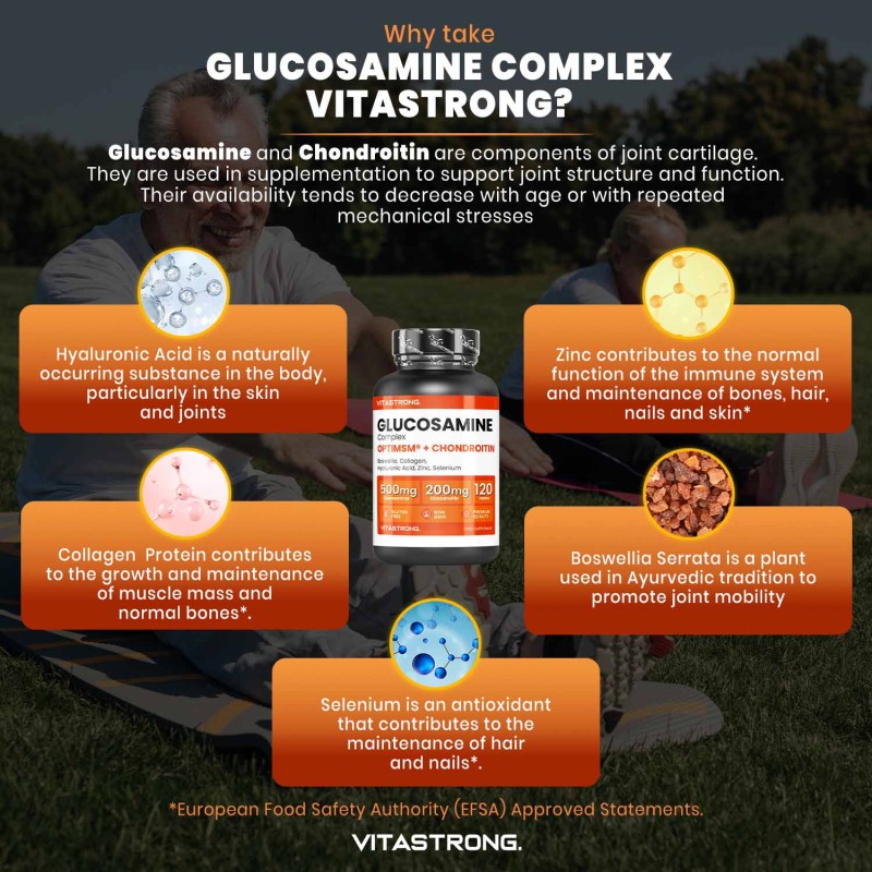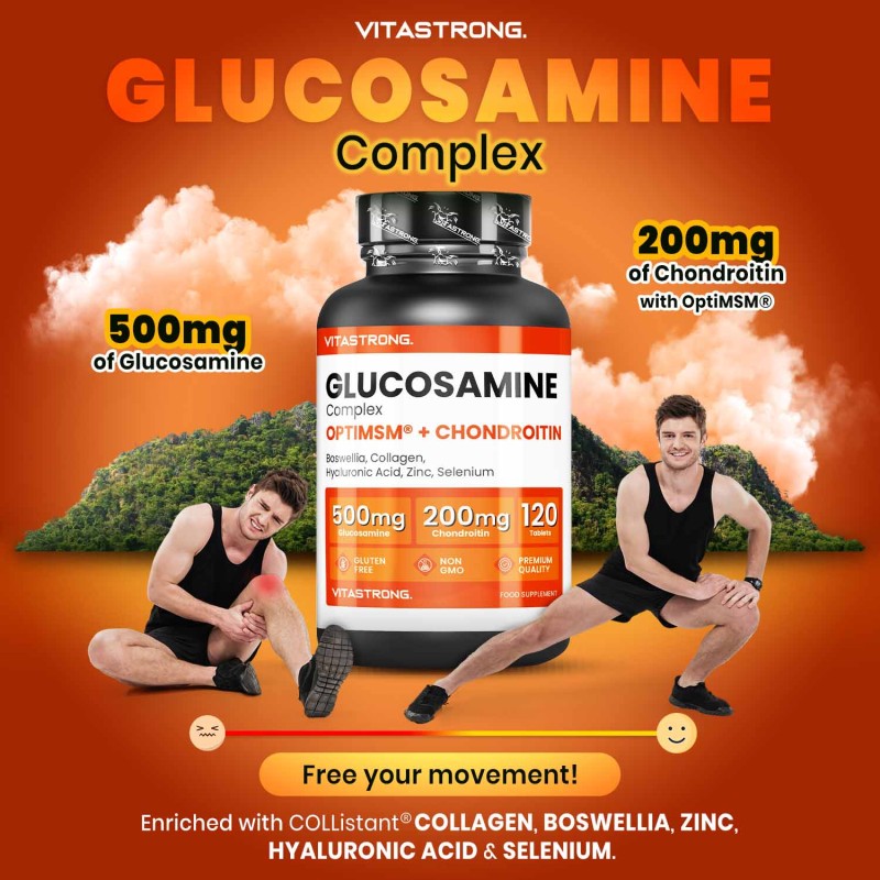 It is born from a powerful synergy of glucosamine, chondroitin and OptiMSM®, enriched with Boswellia , hydrolysed collagen , hyaluronic acid , zinc and selenium , to offer complete and targeted support.