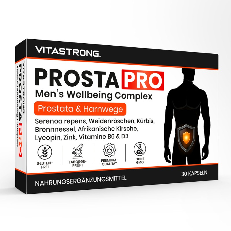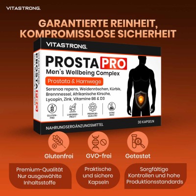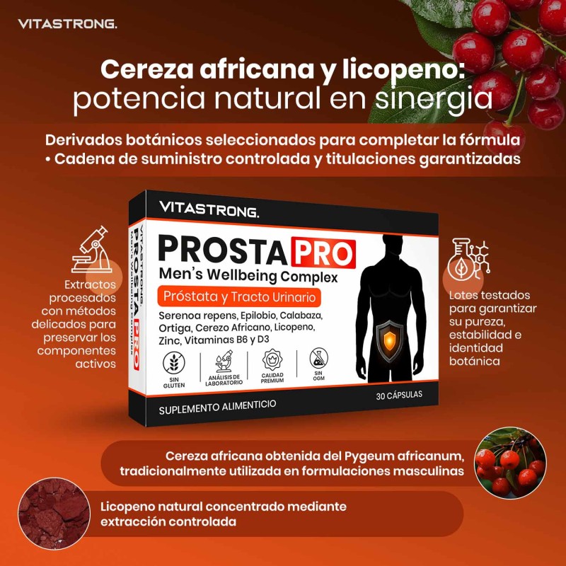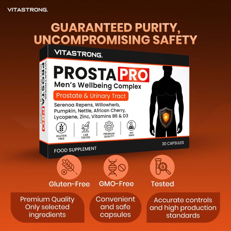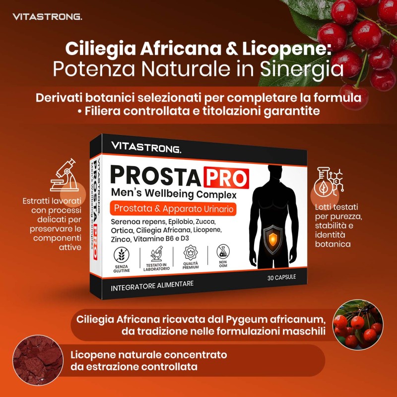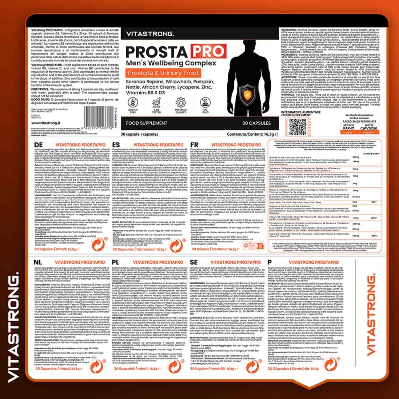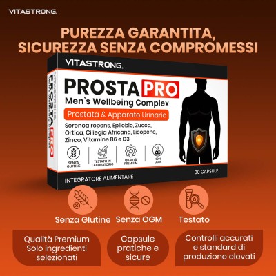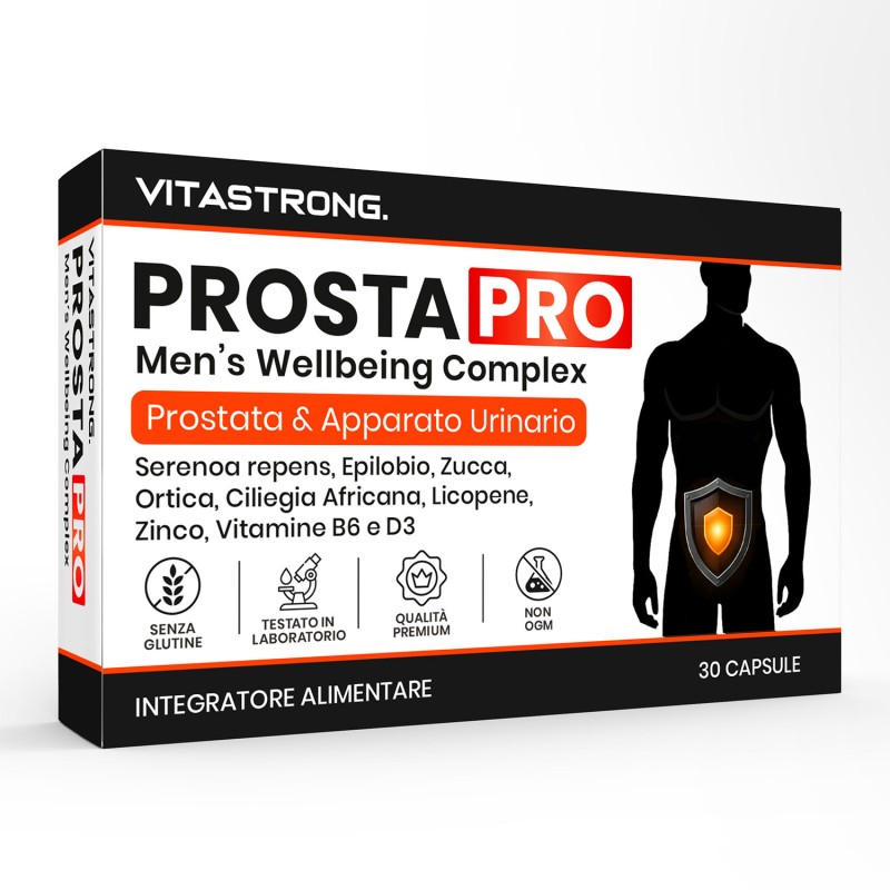 PROSTA PRO is an advanced supplement designed for male well-being , formulated with titrated natural extracts of Serenoa Repens, Epilobium, Pumpkin Seeds, Nettle, Pygeum and Lycopene , in synergy with zinc and vitamins B6 and D3 .
