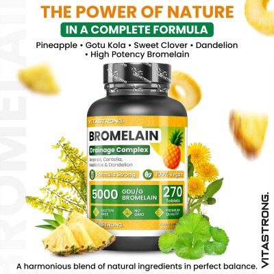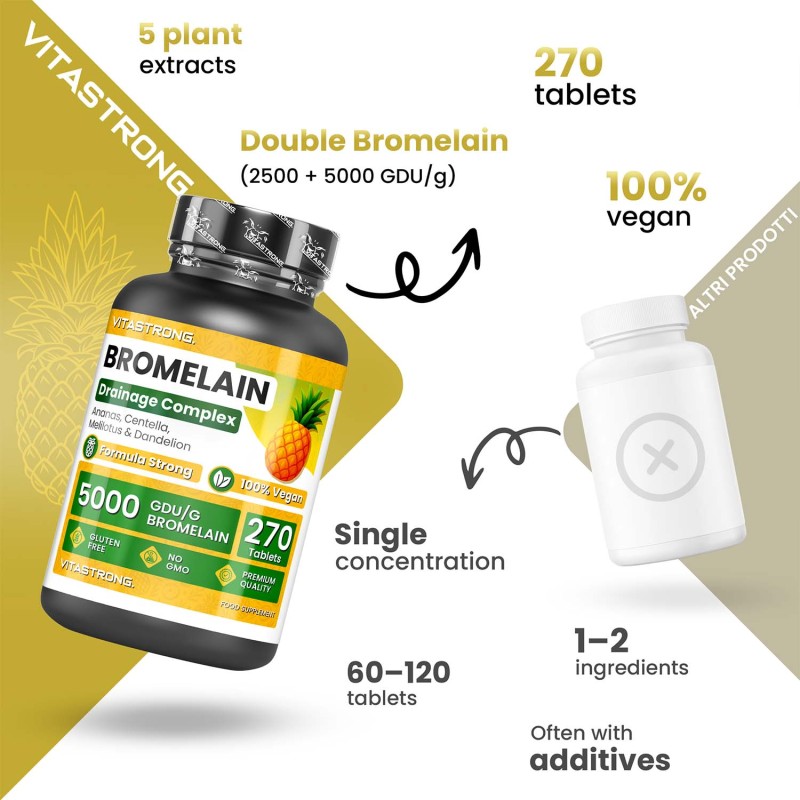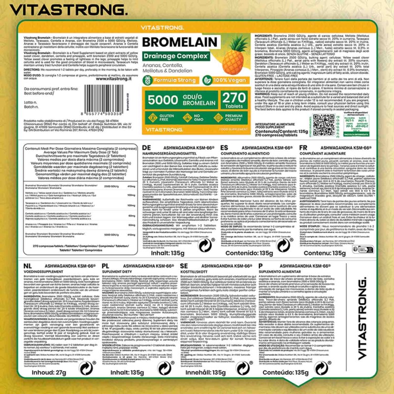 Ingredients: Bromelain 2500 GDU/g, bulking agent: cellulose; Sweet clover (Melilotus officinalis (L.) Pall., aerial part with flower) dry extract titrated 20% in coumarin; Dandelion (Taraxacum officinale (L.) Weber ex FHWigg. , root) dry extract titrated 20% in inulin; Gotu kola (Centella asiatica (L.) Urb., aerial part) dry extract titrated 20% in total triterpenes; Pineapple (Ananas comosus (L.) Merr., stem) dry extract titrated 0.3% in bromelain; Bromelain 5000 GDU/g; anti-caking agents: magnesium salts of fatty acids, silicon dioxide. GLUTEN FREE – LACTOSE FREE