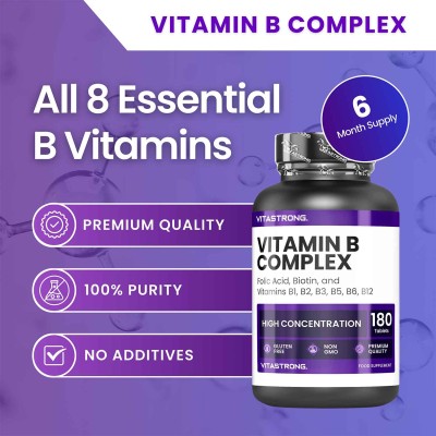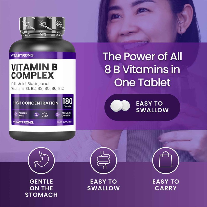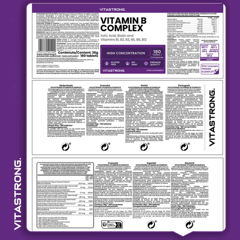 VITASTRONG VITAMIN B COMPLEX is a complete food supplement that combines all the B vitamins with biotin and folic acid, essential for supporting energy, metabolism, nervous system and beauty. This supplement is particularly suitable for those who want to reduce tiredness, maintain normal hair, nails and skin, and strengthen their general well-being.