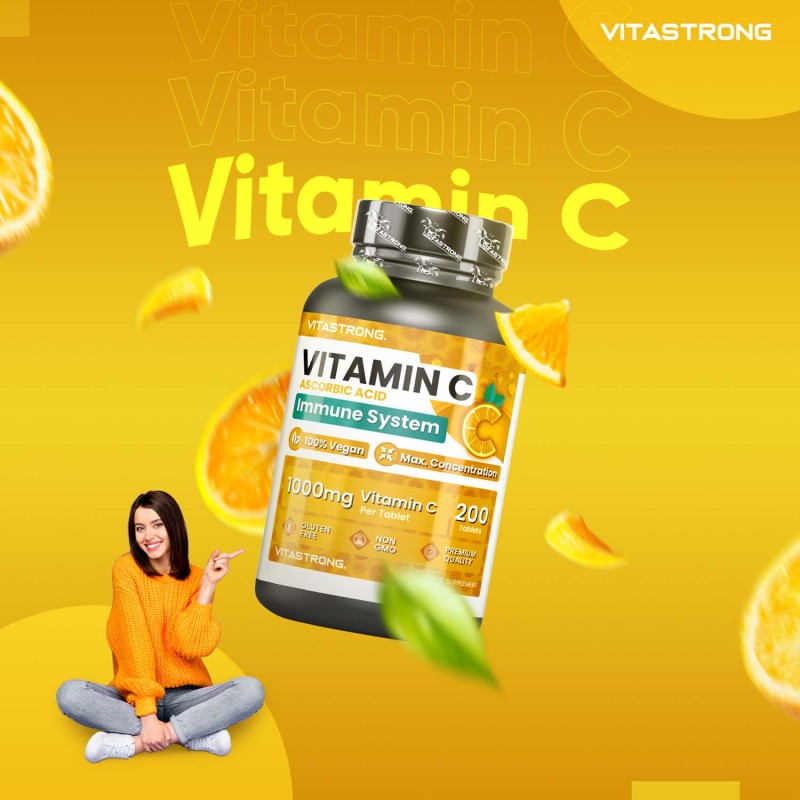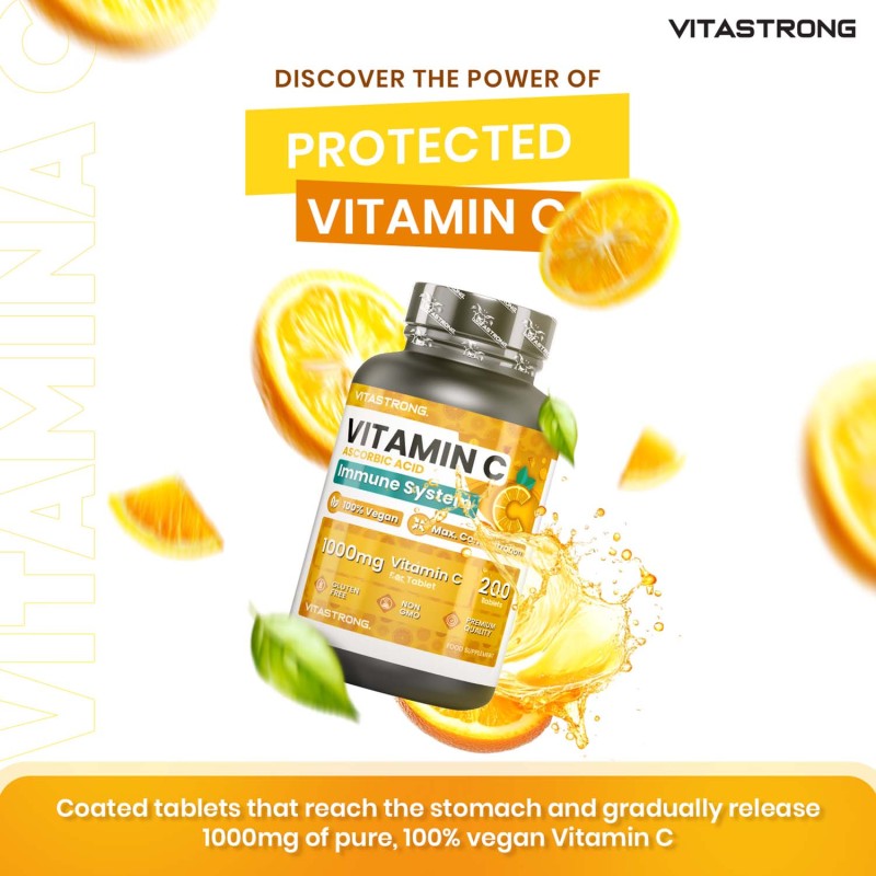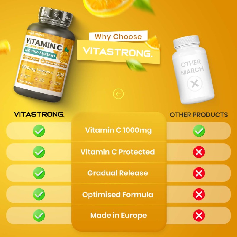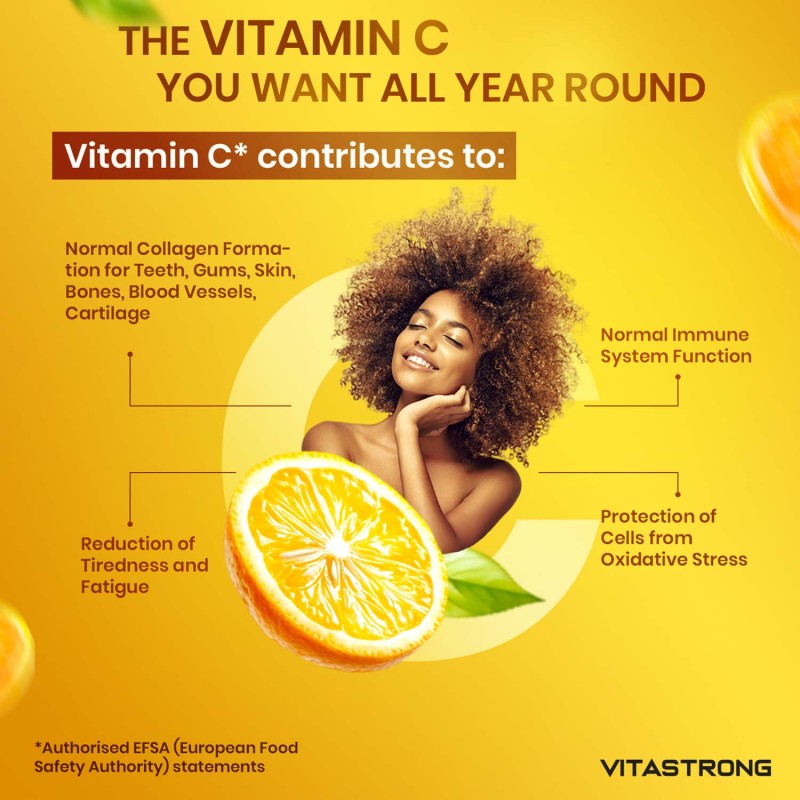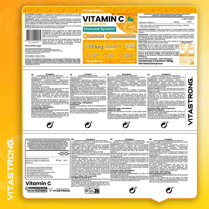 Vitastrong Vitamin C is a supplement based on pure Vitamin C, essential for supporting the immune system, protecting cells from oxidative stress and promoting collagen synthesis, essential for healthy skin, bones and cartilage. Vitamin C is also involved in energy metabolism, helping to reduce tiredness and fatigue, making it ideal for daily support for general well-being.