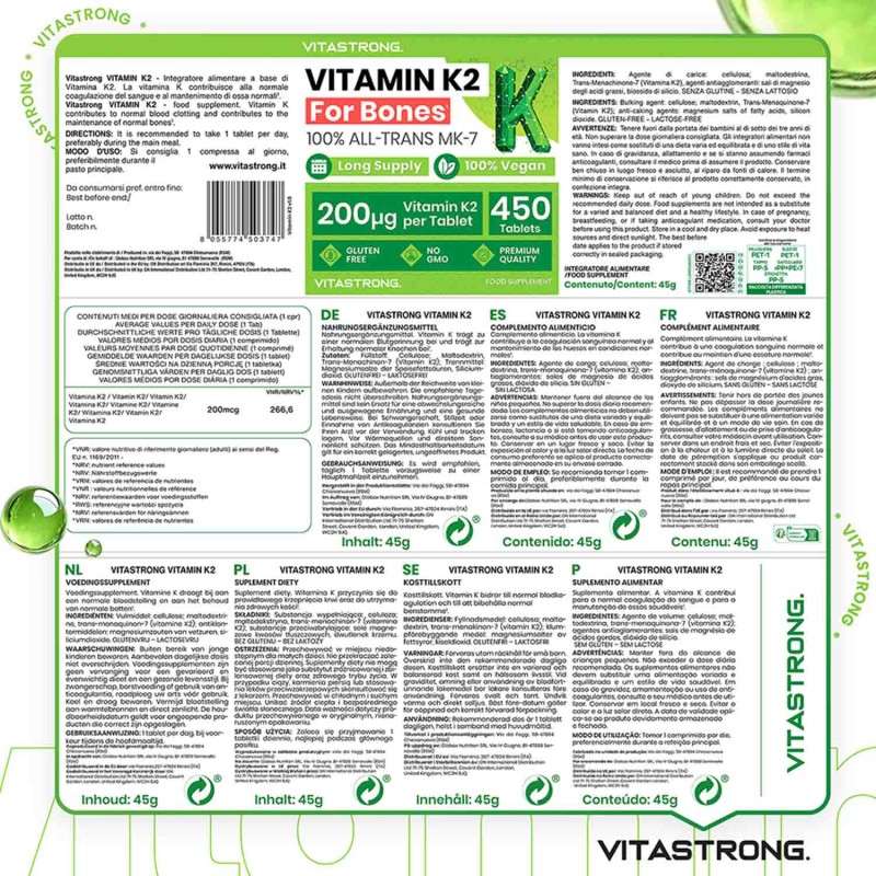 Ingredients: Bulking agent: cellulose; maltodextrin; Trans-Menaquinone-7 (Vitamin K2); anti-caking agents: magnesium salts of fatty acids, silicon dioxide. GLUTEN-FREE – LACTOSE-FREE